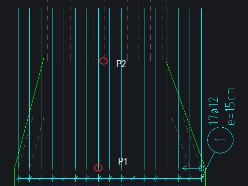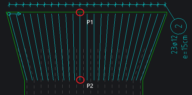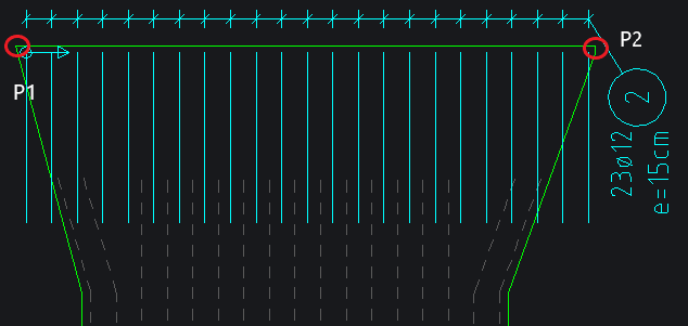 Eingabe der Stablänge über 2 Punkte (P1 – P2) und Addition der Verankerungslänge bzw. Subtraktion der Betondeckung.