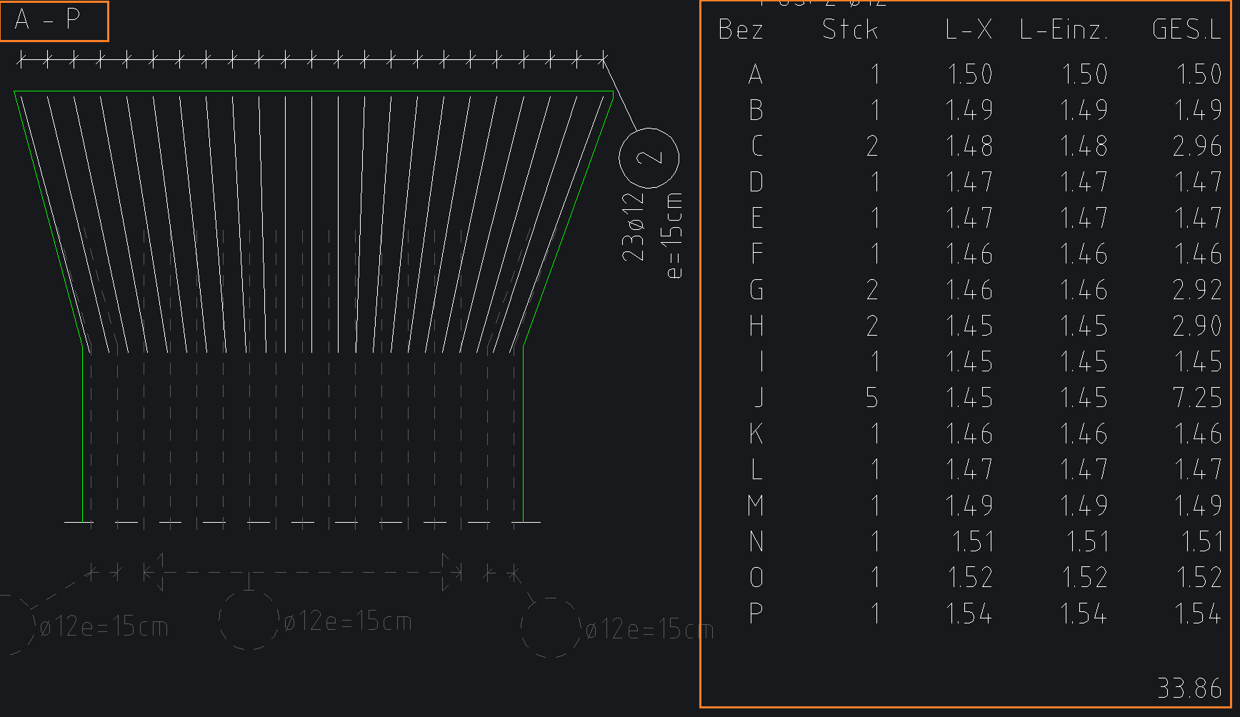 Es sind 2 Verfahren möglich. Eine festgelegte Höhe des Fächers mit unterschiedlichen Stablängen (X-Bewehrung) und eine fächerförmige Anordnung mit gleichen Stablängen.