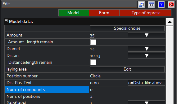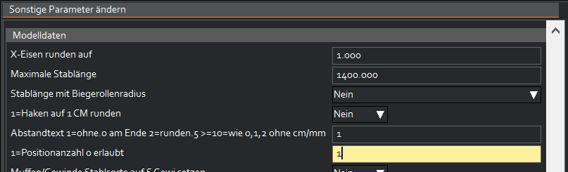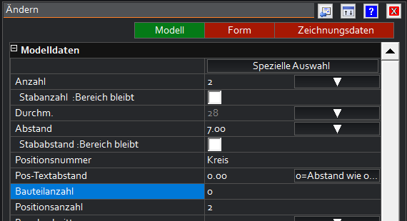Wenn die Positionsanzahl > 1 ist, kann es sinnvoll sein, die Bauteilanzahl auf 0 zu setzen. Bei einer Wiederherstellung der Stabstahlpositionen zu „normalen“ Positionen bleibt die Positionsanzahl bestehen.