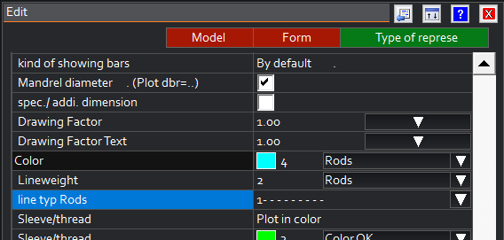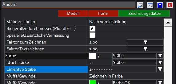 Um die Atrappenpositionen in der Zeichnung deutlicher zu markieren, kann jetzt noch der Linientyp für die Stäbe und/oder die Farbe für die Stäbe geändert werden.