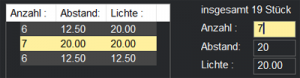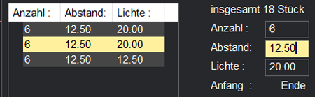 „ANZAHL = LÄNGE / ABSTAND“ = errechnet die Stabanzahl durch Division von Eingabelänge / vorgegebenen Stababstand.