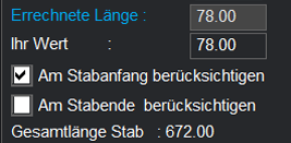 Wenn der entsprechende Stabparameter genau diesen Wert haben soll, muss sein Originalwert vorher auf 0 gesetzt sein. - Am Stabende berücksichtigen = Der errechnete Wert wird dem ersten Stabparameter zugeschlagen.