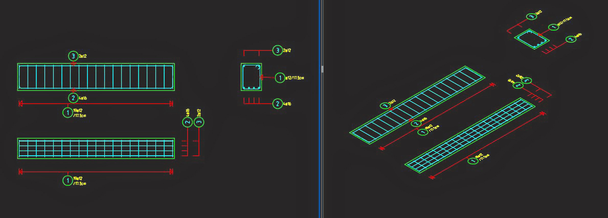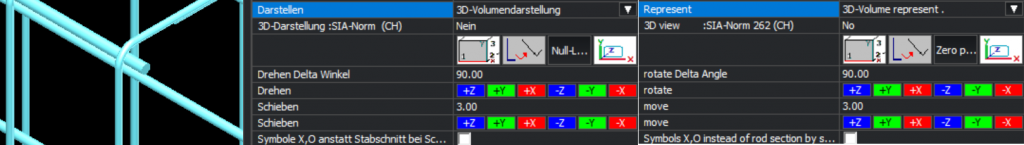 Auch die Bewehrung ist 2-dimensional dargestellt. Jede Darstellung muss gesondert erstellt werden. Hier gibt es allerdings eine logische Verbindung zwischen den einzelnen Darstellungen einer Verlegeposition aufgrund der Bewehrungslogik, so dass Änderungen der technischen Daten sofort und automatisch auf alle Darstellungen übertragen werden. In Sonderfällen können die Stäbe einer solchen Darstellung auch als 3D Linien oder Volumen gezeigt werden.