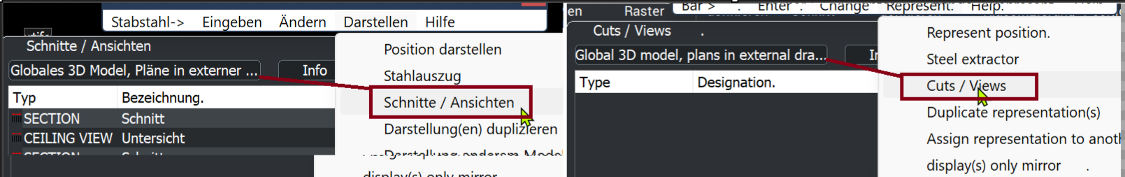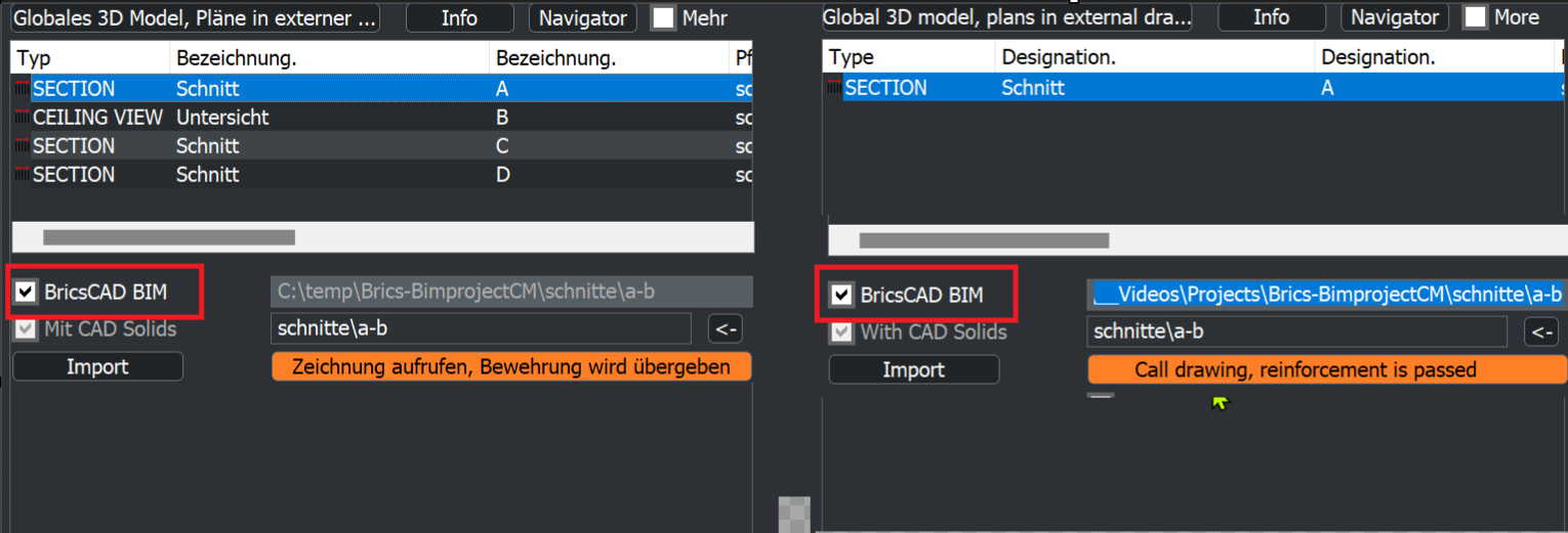 Ist BricsCAD BIM eingeschaltet und der gewählte Schnitt mit dem Button „Zeichnung aufrufen, Bewehrung wird übergeben“ gedrückt, so werden die BricsCAD Befehle BIMSCHNITTAKT“ und „BIMSCHNITTÖFFNEN“ zusammengefasst ausgeführt. Dazu wird automatisch im Hintergrund ein BricsCAD BIM Schnitt oder Drauf-Untersicht Objekt erstellt, die Berechnung der Bauteile in die externe Zeichnung durchgeführt und die Bewehrung übergeben.
